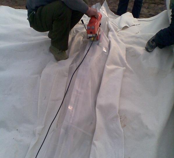 土工布作為土工膜的保護層,使保護防滲層不受損壞。為減少紫外線照射,增加抗老化性能,最好采用埋入法鋪設(shè)。施工中,首先要用料徑較小的砂土或粘土找平基面,然后再鋪設(shè),鋪設(shè)時不要繃得太緊,兩端埋入土體部分呈波紋狀,最后在所鋪的兩布一膜上用細(xì)砂或粘土鋪一層10cm左右過度層。砌上20-30cm塊石(或砼預(yù)制塊)作防沖保護層。施工時,應(yīng)盡力避免石塊直接砸在上,最好是邊鋪膜邊進(jìn)行保護層的施工。兩布一膜與周邊結(jié)構(gòu)物連接應(yīng)采用膨脹螺栓和鋼板壓條錨固,連接部位要涂刷乳化瀝青(厚2mm)粘接,以防該處發(fā)生滲漏。施工接縫處理是一個關(guān)鍵工序,直接影響防滲效果。一般接縫方式有:①搭接:搭接寬度宜大于15cm;②熱焊:宜于稍厚的土工膜基材,焊縫搭接寬度不小于5CM.(不推薦膠接,長時間水浸泡易開膠,防滲效果差.) 。