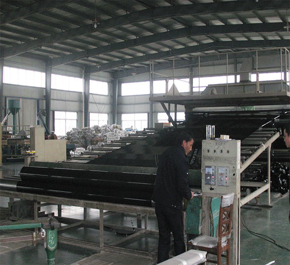 EVA防水板的生產(chǎn)工藝采用先進(jìn)的兩段共擠單摞桿擠出法生產(chǎn), 由原料樹脂EVA加入增強(qiáng)劑、抗氧劑,經(jīng)加熱熔融、塑化、擠出成形、牽引后形 成的板材,也可與穿好吊帶的土工織物(信號(hào)層)熱合成一體,形成復(fù)合防水板, 也可采用擠出壓延法,即將樹脂擠出機(jī)熔融塑化,從機(jī)頭狹縫模口擠出熔融狀的 片坯與吊帶融合一體,經(jīng)輥筒壓延冷卻成光膜,或與穿好吊帶的土工織物融合一 體,經(jīng)輥筒壓延冷卻成復(fù)合防水板材。